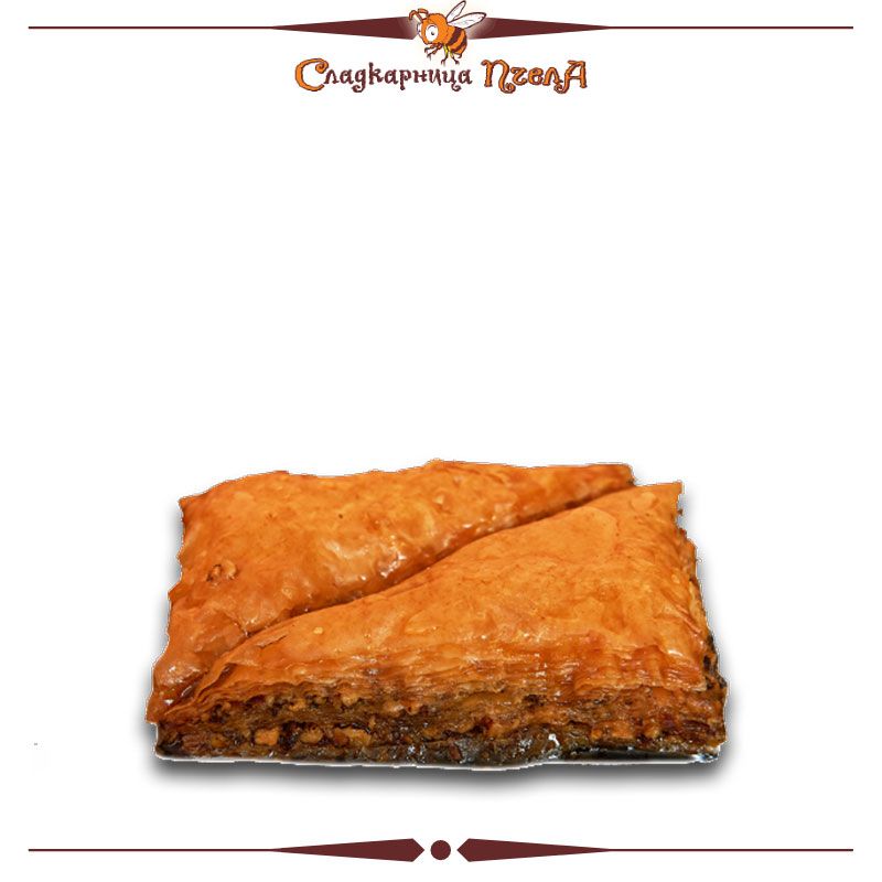 Всеки слой от хрупкави кори е щедро напоен с ароматен сироп и съчетава в себе си нежната сладост и деликатната текстура на орехите.