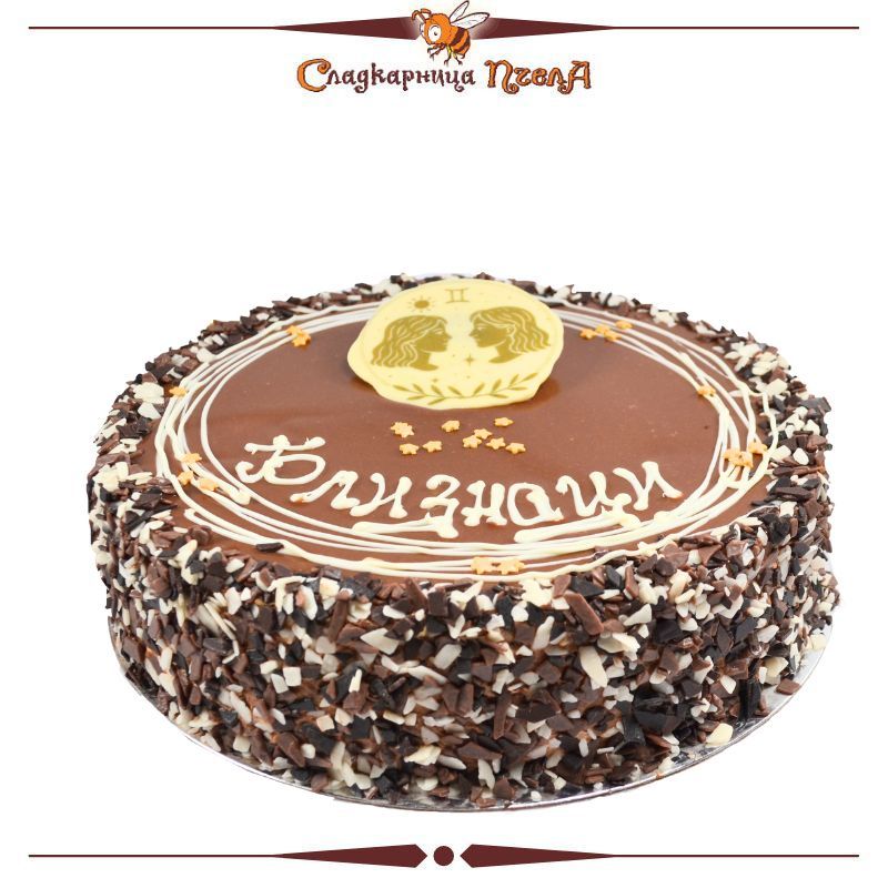 Декорацията е уникална – смесица от бели, млечни и натурални шоко парченца, които ще изкушат всеки шоколадов фен, както и шоколадова плочка с избраната от Вас зодия.