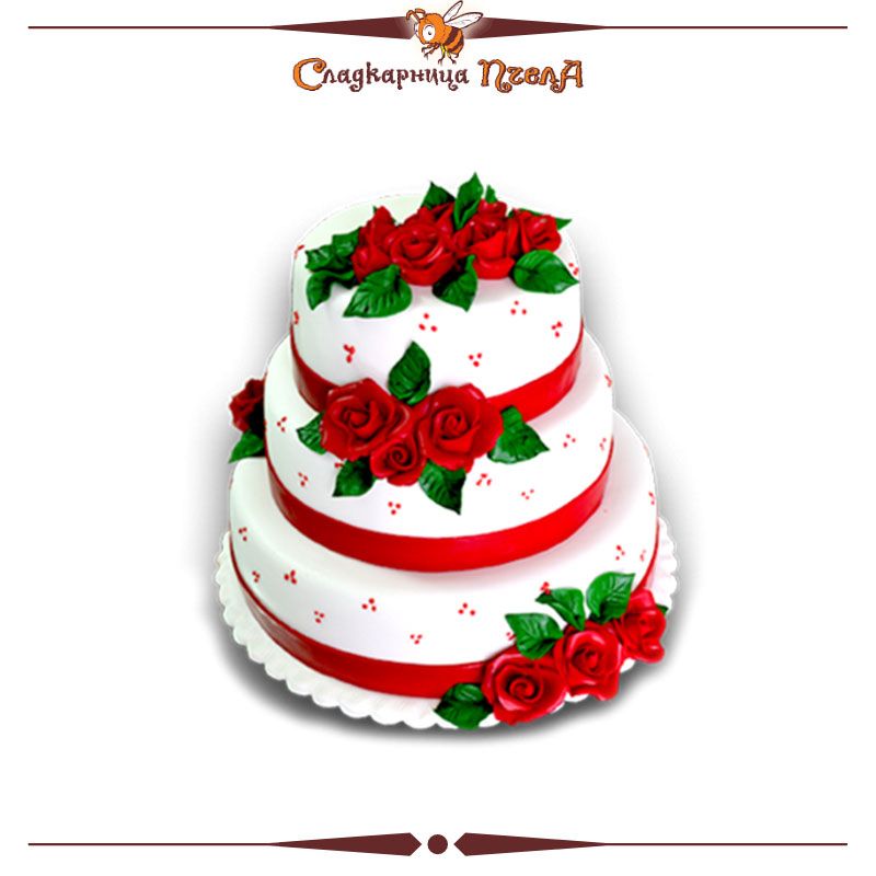 Показаната торта е на 3 етажа и е за 50 парчета.