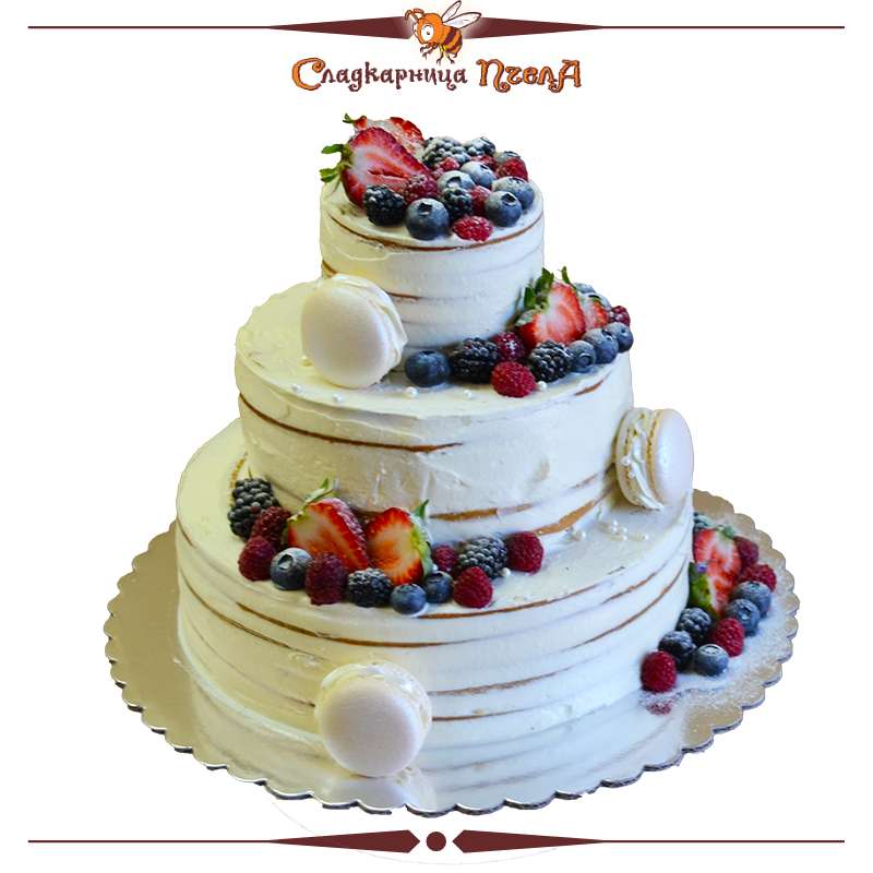 Показаната торта е на 3 етажа и е за 30парчета. Пълнежът е френска селска торта.