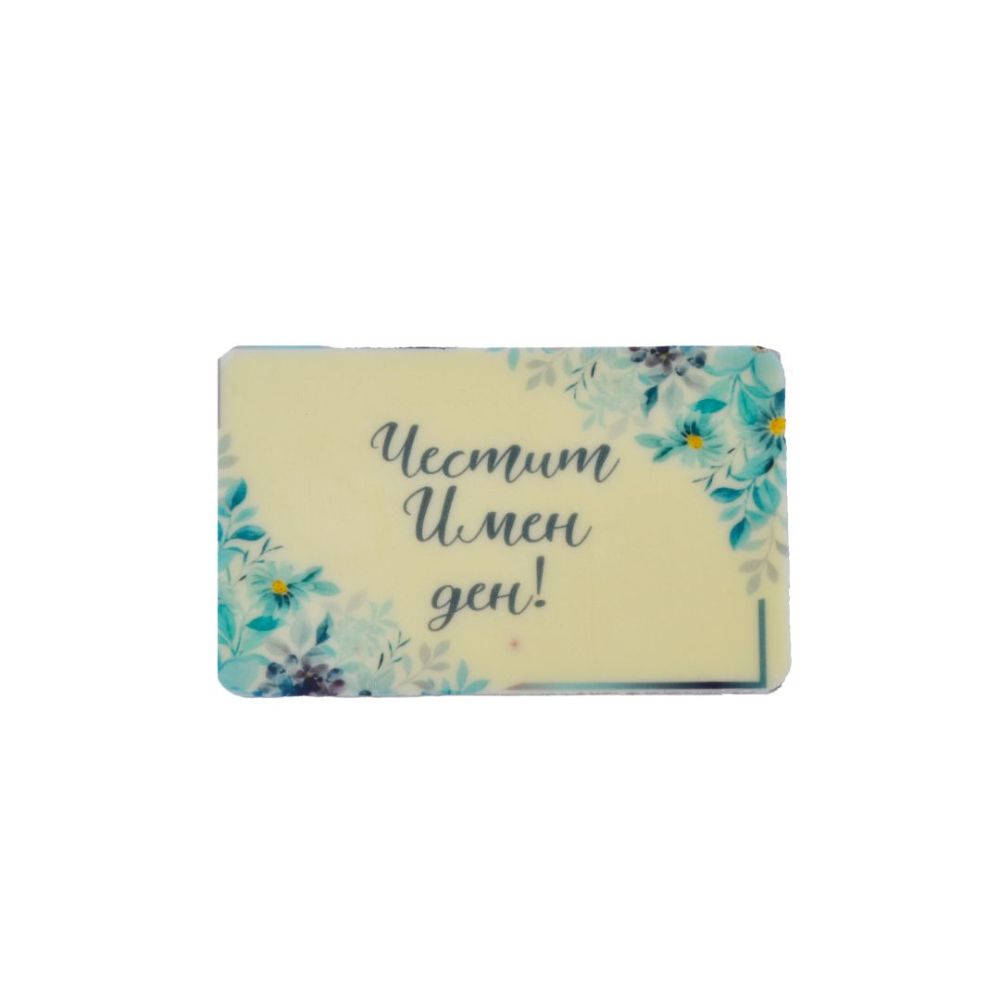 Шоколадова плочка с надпис с размер 9/5,5 см. Пълноцветно отпечатана върху бяла плочка с дебелина 2 мм с хранителни бои.