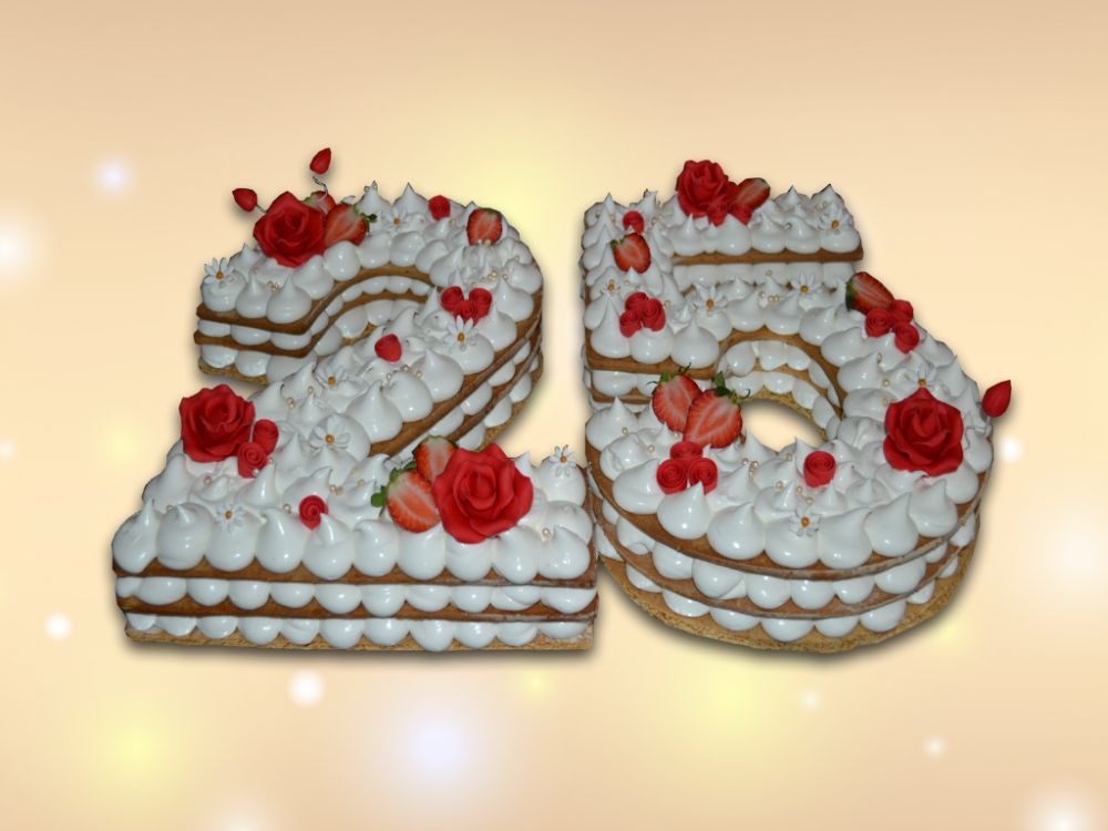 Юбилейна торта с медени платки и крем от заквасена сметана. Цифри 0, 6, 9, 8 са за 20 парчета. Цифри 1, 2, 3, 4, 5, 7 са за 15 парчета. Поръчка поне 3 дни по-рано. Ягодите са сезонна опция и през зимата не се поставят!