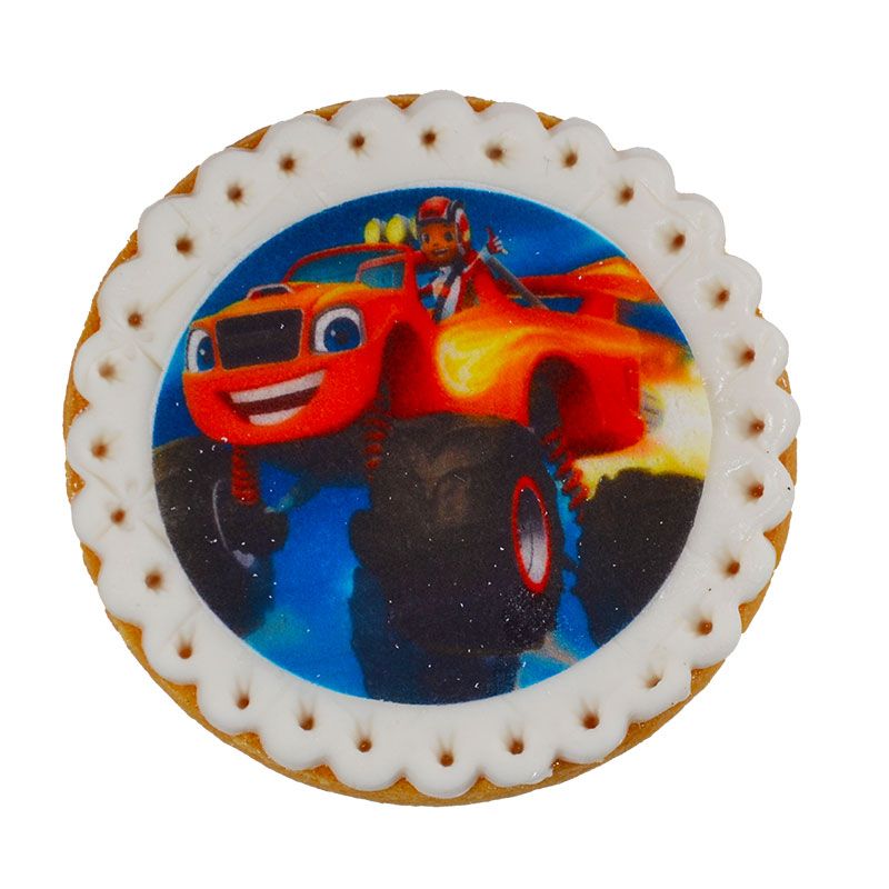 Фото бисквитка с краве масло и фонданова декорация. Диаметър 7,5 см. Всяка бисквитка се опакова индивидуално в целофаново пликче.