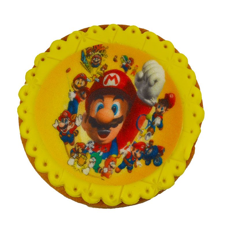 Фото бисквитка с краве масло и фонданова декорация. Диаметър 7,5 см. Всяка бисквитка се опакова индивидуално в целофаново пликче.
