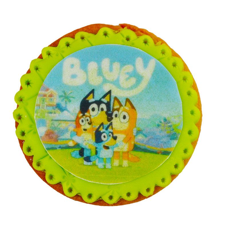 Фото бисквитка с краве масло и фонданова декорация. Диаметър 7,5 см. Всяка бисквитка се опакова индивидуално в целофаново пликче.
