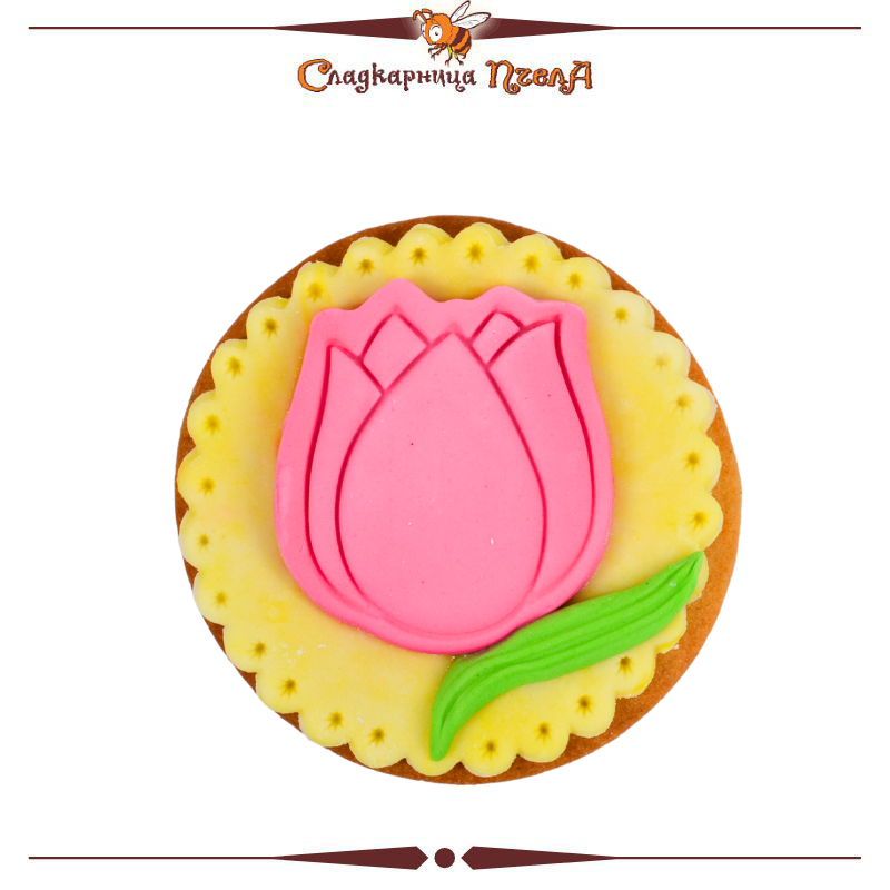 Бисквитка с краве масло и фонданова декорация. Диаметър 7,5 см. Всяка бисквитка се опакова индивидуално в целофаново пликче.