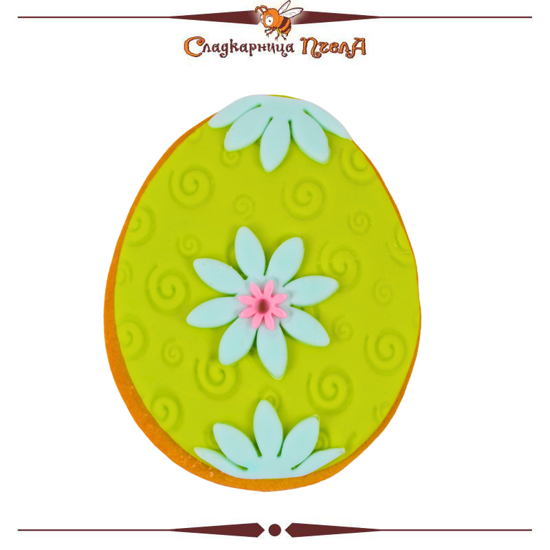 Бисквитка с краве масло и фонданова декорация. Диаметър 7,5 см. Всяка бисквитка се опакова индивидуално в целофаново пликче.