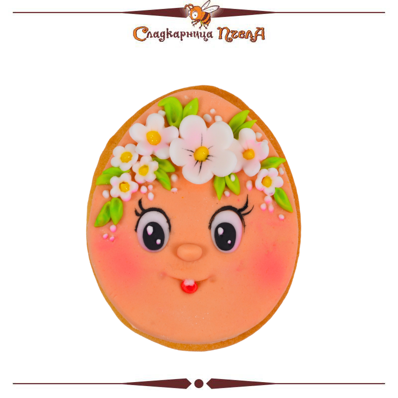 Бисквитка с краве масло и фонданова декорация. Диаметър 7,5 см. Всяка бисквитка се опакова индивидуално в целофаново пликче.