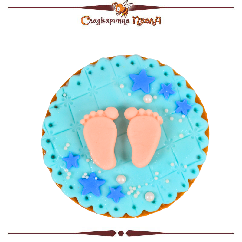 Бисквитка с краве масло и фонданова декорация. Диаметър 7,5 см. Всяка бисквитка се опакова индивидуално в целофаново пликче. Може да бъде и в розов вариант.